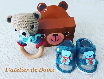 -d'une paire de sandales tricotées au crochet, coton oeko-tex, ornées d'un bouton "petit ourson", fermées par un petit bouton en nacre