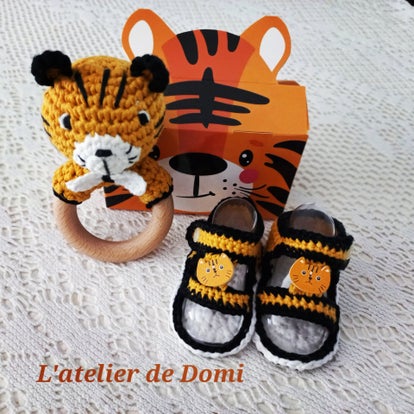-d'une paire de sandales, taille nouveau né, réalisées au crochet avec décoration en bois "Petit Tigrou", fermées avec petit bouton de nacre
