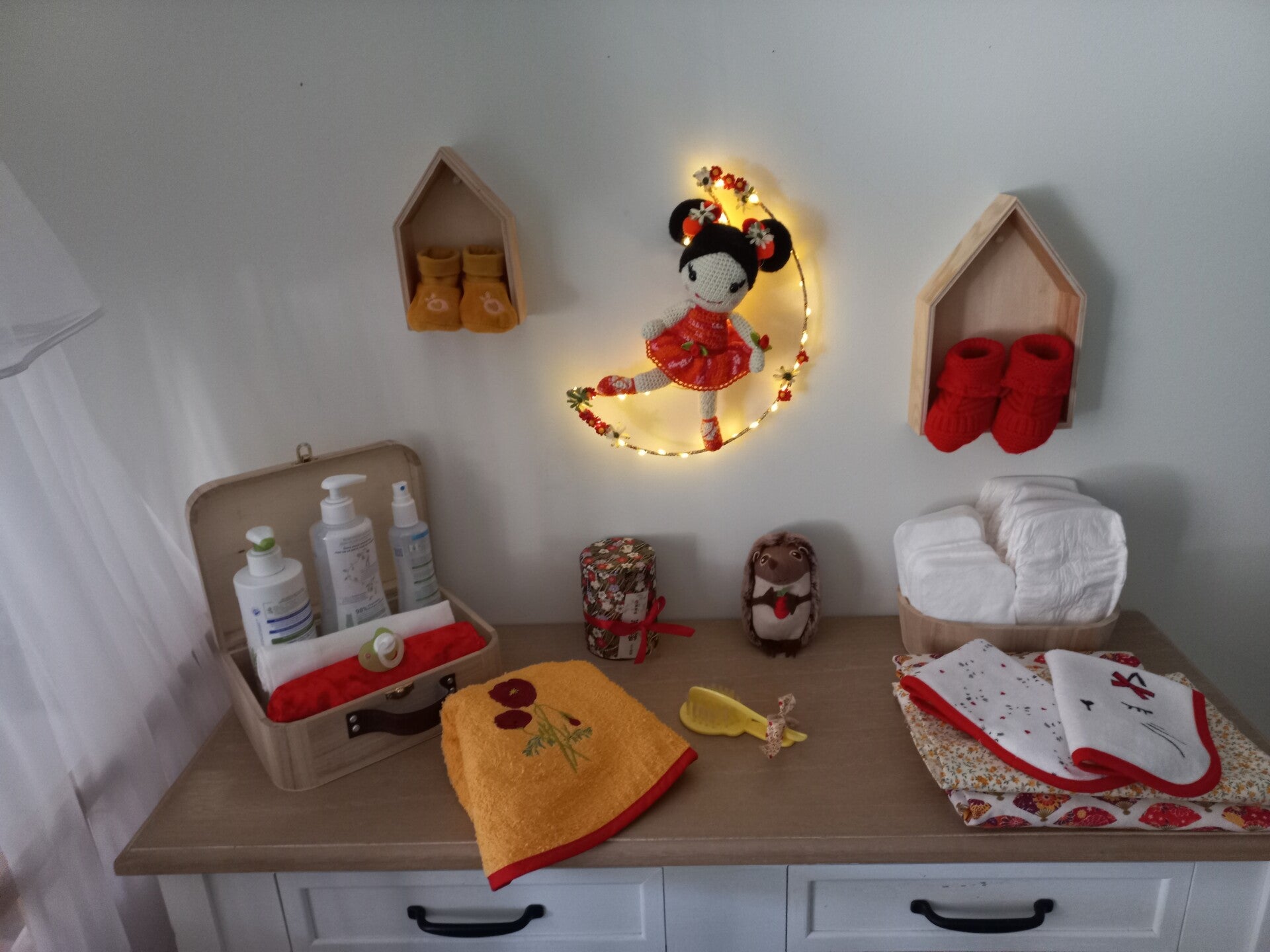 Elle est tricotée au crochet et repose sur une lune ornée de fleur. Elle offre une petite lumière rassurante, elle est du plus bel effet sur un mur dans une chambre d'enfant
